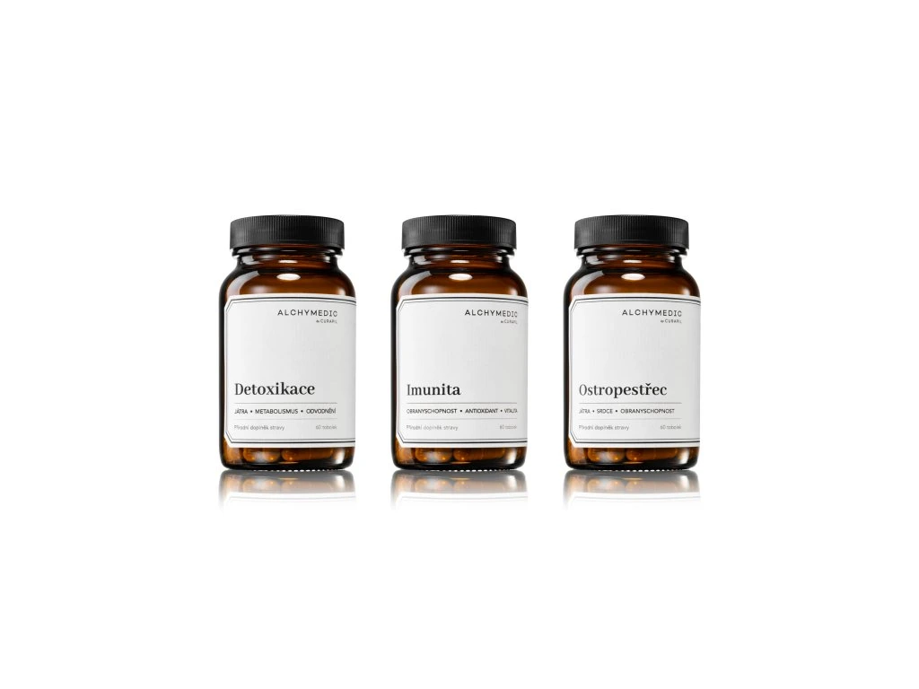 Složení: Balíček obsahuje 3 samostatné produkty Alchymedic. Podrobné složení naleznete na stránkách jednotlivých produktů: Detoxikace (komplex bylinných extraktů pro očistu), Imunita (bylinné extrakty pro obranyschopnost), Ostropestřec (extrakt ze semen Silybum marianum – silymarin). Všechny tobolky jsou rostlinné.