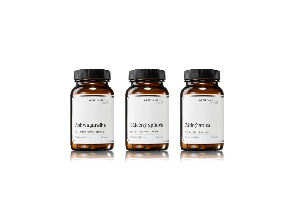 Složení: Balíček obsahuje 3 samostatné produkty Alchymedic. Podrobné složení naleznete na stránkách jednotlivých produktů: Ashwagandha (extrakt z kořene Withania somnifera), Žádný stres (šišák bajkalský, třezalka, valeriána a další), Báječný spánek (kozlík lékařský, šišák bajkalský, meduňka, mučenka, chmel, ženšen). Všechny tobolky jsou rostlinné.